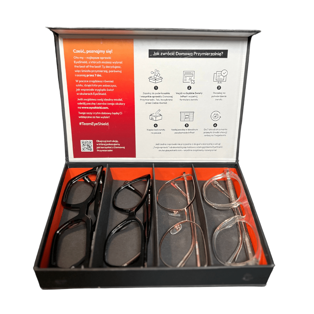 Jeśli 4 oprawki to dla Ciebie za mało, to możesz zamówić więcej domowych przymierzalni, np. 2-3. Wtedy koszt wysyłki w dwie strony na terenie Polski to dalej tylko 20 zł.